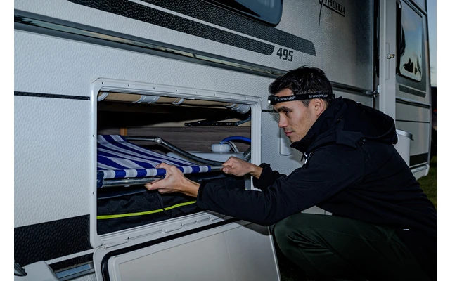- Der Schalter der Stirnlampe ermöglicht ein Wechseln der Funktionen auf Knopfdruck: 100 % – 20 % – SOS