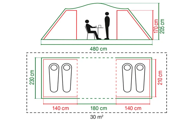 Das Zelt bietet Platz für insgesamt 4 Personen und ist mit 2 großen Schlafkabinen und einem großzügigen hellen und geräumigen Wohnbereich ausgestattet.