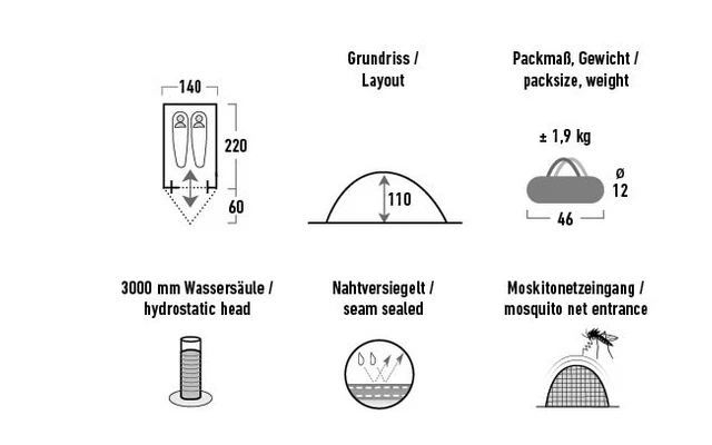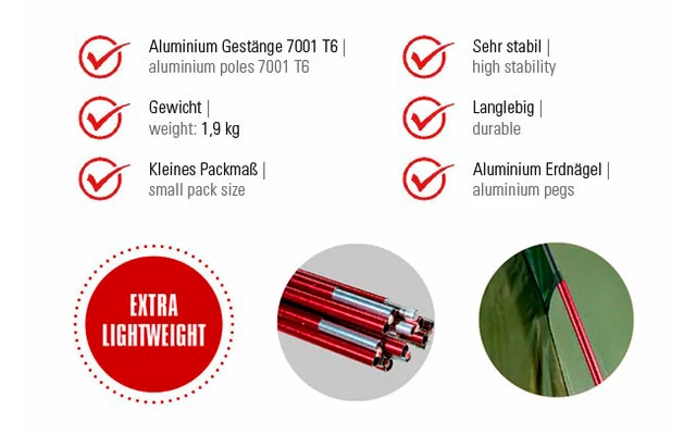 - Außenzelt: 190T Polyester PU, 3.000 mm