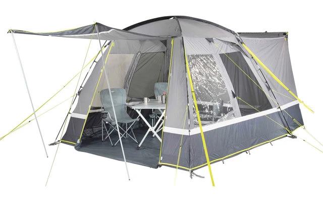 Die rechten Seitenwände bieten ein optimales Raumgefühl. 3 Dachstützgestänge stabilisieren das Zelt. Das Vordach mit Wetterblenden schützt vor Wind, Regen und bietet Schatten. Der fest vernähte Boden mit dem Außenzelt verhindert das Eindringen von Schmutz, Nässe, Krabbeltieren und schützt vor Zugluft. Die Verandafront lässt sich je nach Wetterlage bis zur Mitte oder ganz öffnen. Die Bodenwanne kann an der Front herunter geklappt werden und verhindert Stolperfallen. Gazefenster aus extra starkem, reißfestem 150D „Superfine“ Moskitonetz belüftet den Wohnbereich und halten Insekten aus dem Zelt fern. Die innenliegende Reißverschluss Fensterklappe ist einfach zu bedienen und wird variabel als Dauerventilation eingesetzt. Gaze-Seitentür aus 150D „Superfine“ Moskitonetz für mehr Bewegungsfreiheit und Belüftung. 2 Klarsichtfolienfenster mit innenliegenden Reißverschluss- Fensterklappen können einfach und variabel bedient werden. Eine Hochentlüftung belüftet das Zelt an regnerischen Tagen.