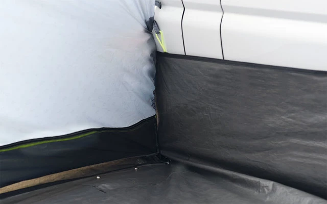 Das frei stehende Kuppel-Vorzelt Milestone Shade eignet sich perfekt für kleinere Campingplätze. Es verfügt über eine Tür an der Seite der Link Access Zone und einen Seiteneingang sowie über eine Gewebebahn zur Höhenverstellung an der Innenseite. Das Vorzelt lässt sich schnell und einfach an Bussen mit einer Höhe zwischen 175 und 200 cm anbauen. Die flach zusammenfaltbare Vordertür unter dem abgerundeten Vordach ist mit einem Moskitonetz ausgestattet und die durch Netzstoff geschützte Belüftungsöffnung an der Spitze verbessert das Klima im Zelt. Vorderseite lässt sich für mehr Flexibilität vollständig öffnen: die Frontwand und der Eingang werden mithilfe eines Vier-Wege-Reißverschlusses geöffnet, um einen Verandabereich zu schaffen, der durch ein Moskitonetz geschützt ist.