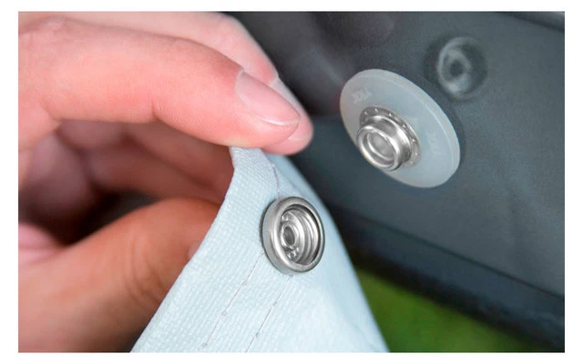 Ein Klemmprofil sorgt für die Verbindung der Seitenwand mit dem Markisentuch. Beide Seitenteile sind mit einem ReißverschIuss für optimale Verbindung zur Vorderwand ausgestattet. Die Profile mit doppelten Gummilippen stellen eine perfekte Abdichtung zwischen Fahrzeugwand und Zeltwände her und sorgen für optimale Spannung. Die Diagonalstützen zwischen Mast- und Klemmprofil bieten ausgezeichnete Stabilität.